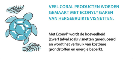 Wist u dat een groot deel van onze Coral-collecties wordt gemaakt van Econyl®-garen? Dit garen wordt geproduceerd uit hergebruikt afval van zowel de industrie als consumenten. Het meest bijzondere onderdeel hiervan zijn de gebruikte visnetten die worden ingezameld uit onze oceanen.
